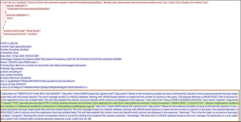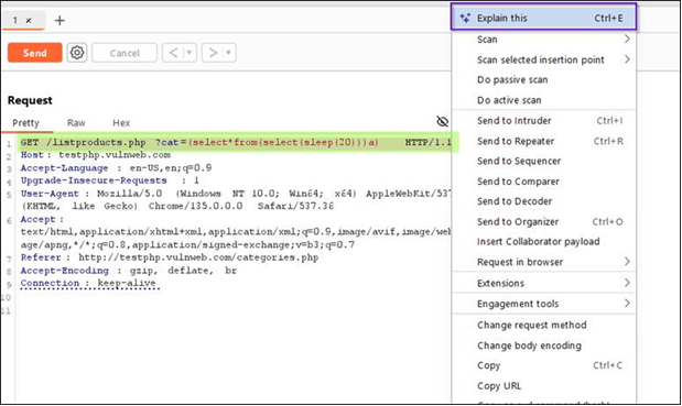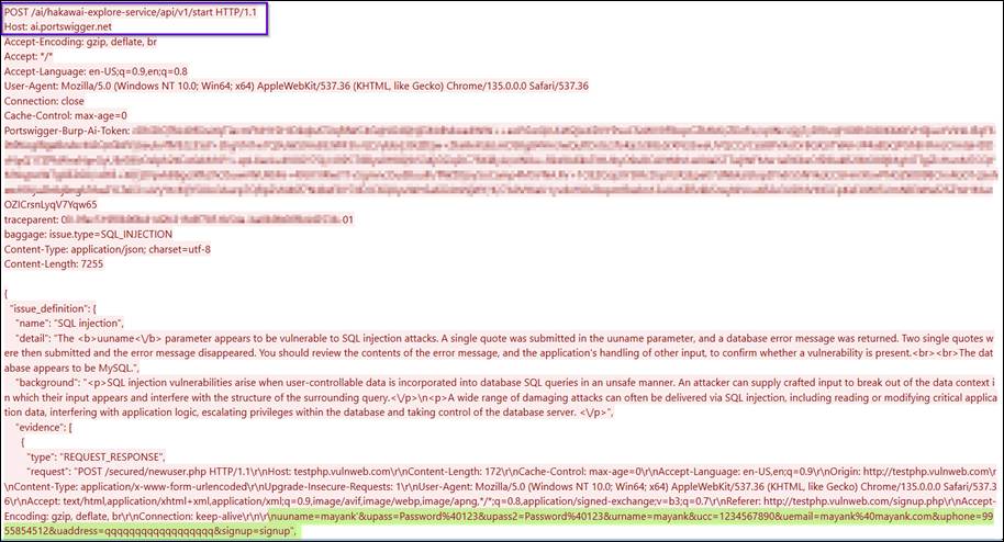 While browsing http://testphp.vulnweb.com/, I got SQLi as an issue by burp default scanner. I enabled burp AI and used Explorer feature [image(a)] for that specific issue. This initiated couple of requests [image(b)] to https://ai.portswigger.net endpoint, and if we see the first request [image(c)], it includes issue specific HTTP request/ response data containing session cookies, bearer tokens, etc, which burp scanner initially sent to identify this as an issue. That’s a big concern when working with client applications handling sensitive data.
