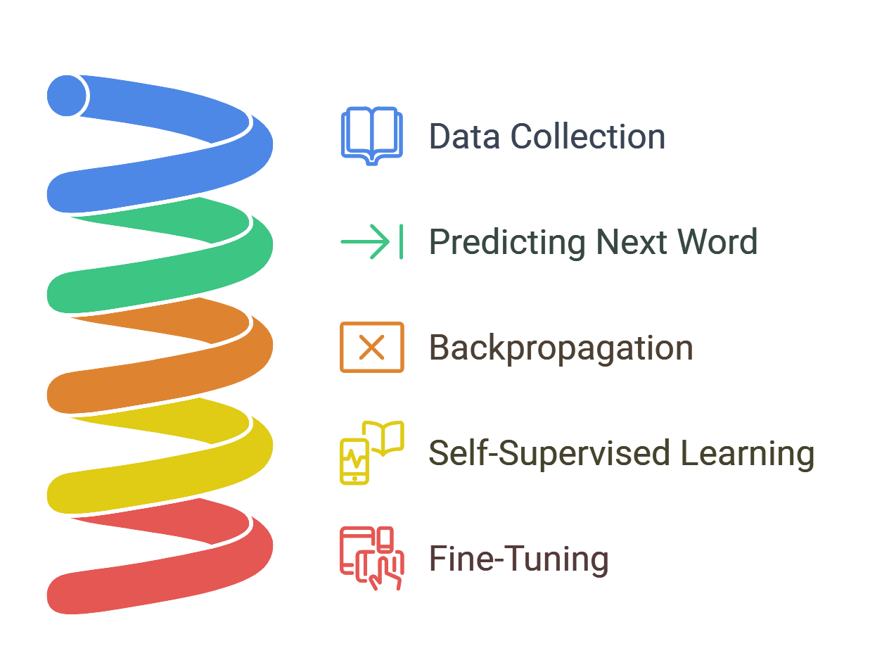The training process uses a technique called self-supervised learning. In self-supervised learning, the model teaches itself by trying to predict missing pieces of information. For example, it predicts the next word in a sentence and based on whether the prediction is right or wrong, it adjusts itself. This helps the model gradually understand language patterns and improves its ability to generate meaningful text.